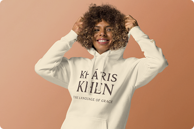 Soft ring-spun cotton blend. Unisex fit so it actually feels good on your body. Front pouch pocket because pockets matter. "KHÁRIS & KHEN - The Language of Grace" printed across the front, simple and bold.